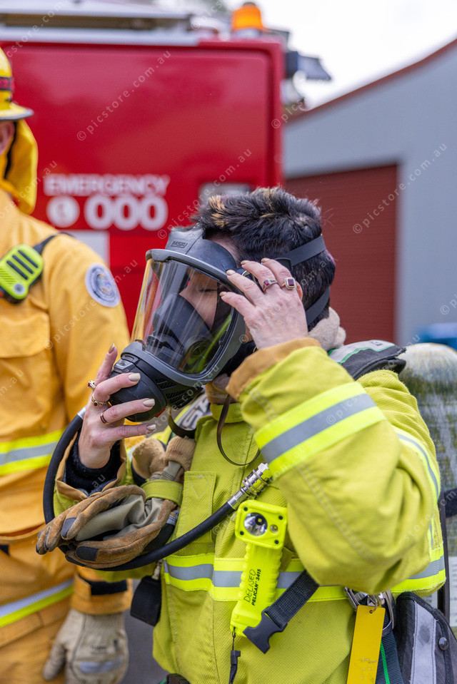 Firefighter Rebecca Deliseo puts on BA (Breathing Apparatus) to show the people attending the open day.