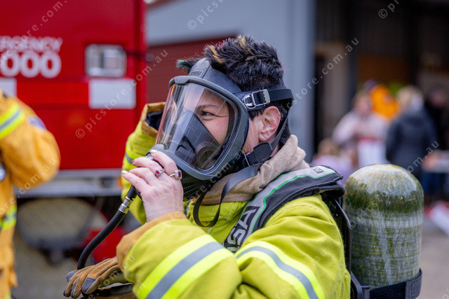 Firefighter Rebecca Deliseo puts on BA (Breathing Apparatus) to show the people attending the open day.