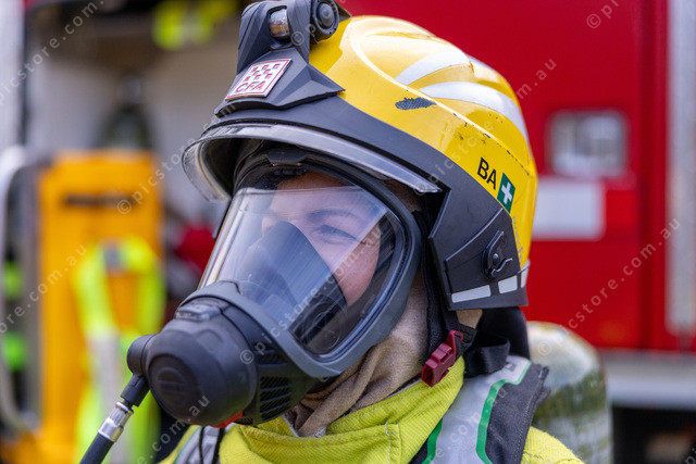 Firefighter Rebecca Deliseo puts on BA (Breathing Apparatus) to show the people attending the open day.