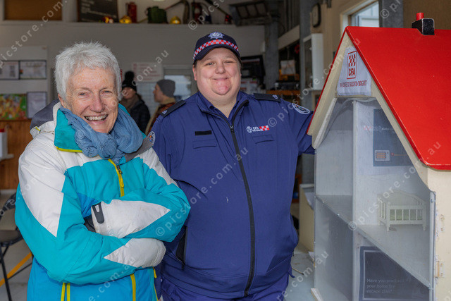 L-R Mary Nymyer and Racheal Holland next to a display about smoke detectors in homes.