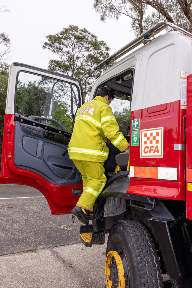 Firefighter Rebecca Deliseo climbs into the tanker.