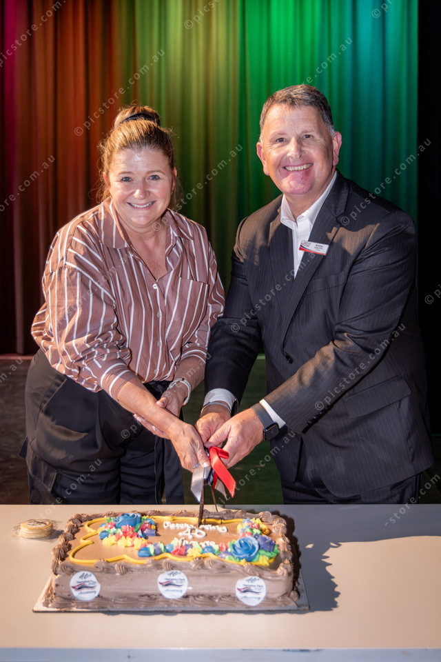Photo: L-R Justine Smythe Senior Education Improvement Leader and Wayne Howorth Principal. Cake cutting.