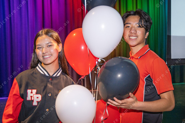 Photo: L-R Wida Hussaini and Kenny Pham who spoke on stage at the event with balloons in the school colours.