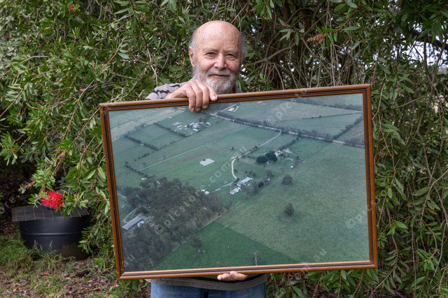 Peter Cogo with and old aerial photo of the property before the trees were planted.