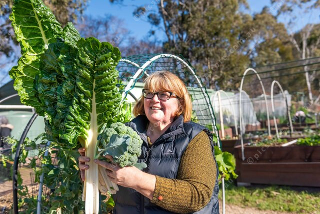 Kim Gillam with Silver beet grown in locally made mulch and compost. 485283_04