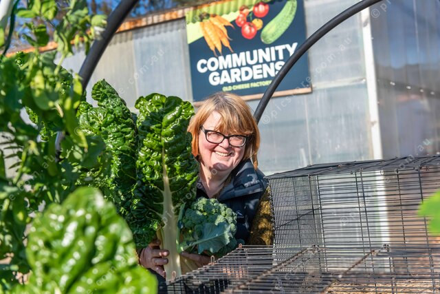 Kim Gillam with Silver beet grown in localy made mulch and compost. 485283_15