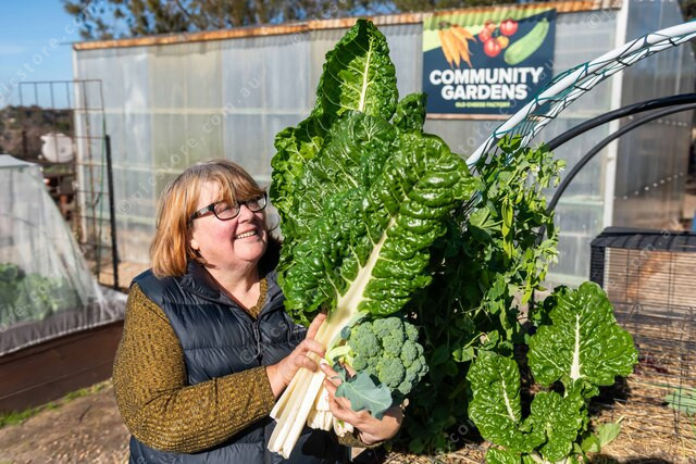 Kim Gillam with Silver beet grown in localy made mulch and compost. 485283_17