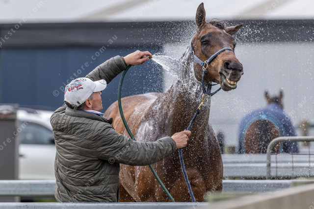 Clint Bilson from Moorooduc gives Royal Reign a Royal Rain.