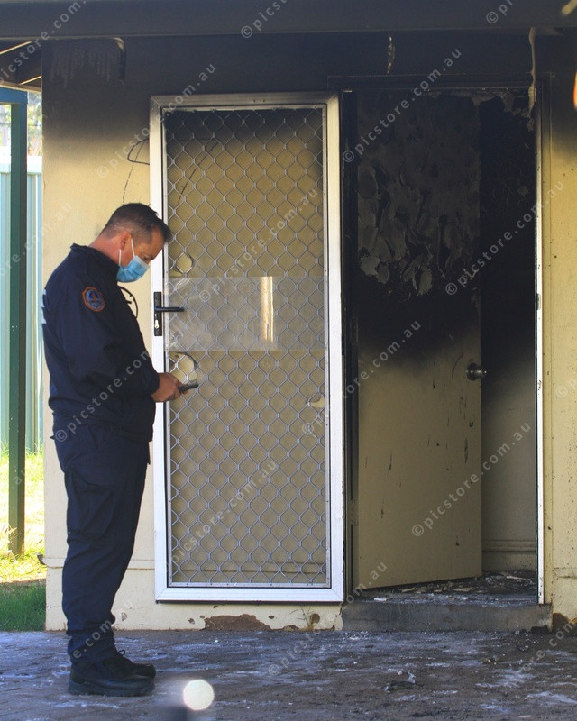 DAMAGED: A police officer standing by the damaged front door of a house destroyed in a fire in Parke Crescent. (PIC: PHIL WILLIAMS 484250_04