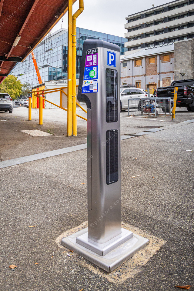 New parking meter along Mason St. I was charged $2:30 per hour at this meter. These are ticketless just Rego number. Solar Panels on the rear.