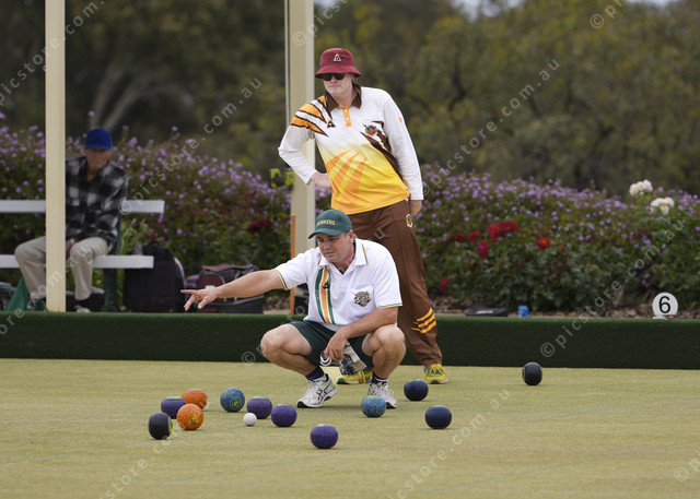 Matthew West and Laurie McLaine during the 2025 Sunraysia Bowls Association Lawn Bowls round 7 match between Workers and Merbein.