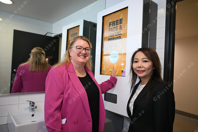 Expansion of the free provision of period products from libraries to shopping centres. Pic of local MP Natalie Hutchins and Brimbank mayor Cr Thuy Dang. Photo by Damjan Janevski. 476705_02