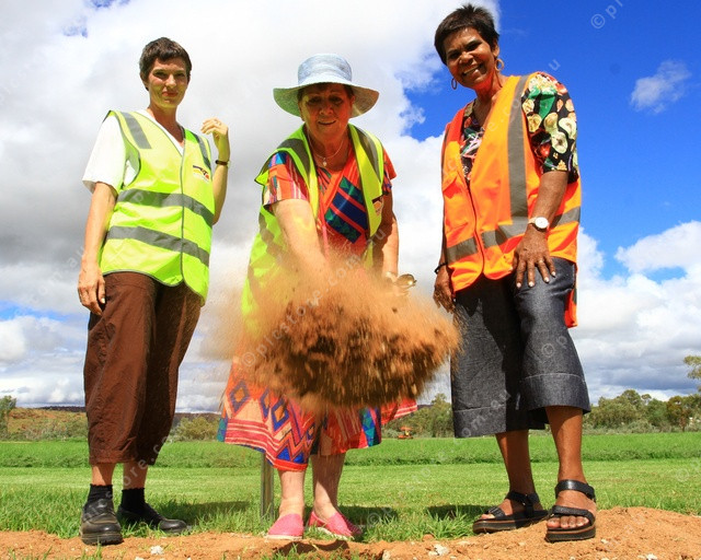 TOSS: Mayor Asta Hill and Member for Lingiari watch on as Linda Fitzsimons tosses the first sod on the oval upgrade. (PIC: PHIL WILLIAMS 536198_02)