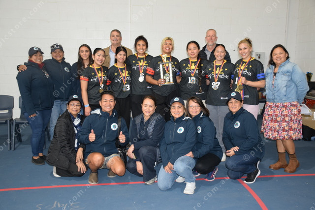 Stanthorpe High School Principal Justin Kuskie, Cr Russell Wantling, and members of the Granite Belt Filipino community congratulated Brisbane Market Square on their women’s volleyball win. (Samantha Wantling: 487248)