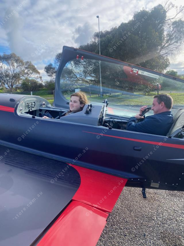 Logan is very happy after completing the aerobatic Extra 300 with instructor Leo.