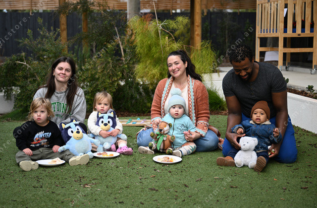 Woodlands Early Learning Centre, Sunshine West, Teddy Bear Picnic. Pic of: mum Jemma Lawn with her kids Vann (2) and Aspen (2); mum Jacinda Suarez with her 11-monts-old son Cortez; and dad Vukosi Mdaka with kis son Myles (1). (Damjan Janevski). 484577_02