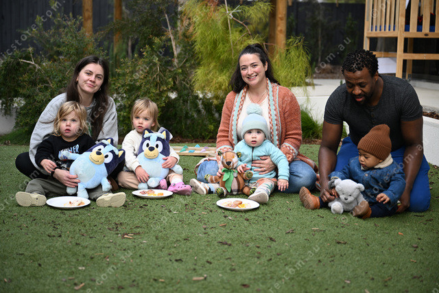 Woodlands Early Learning Centre, Sunshine West, Teddy Bear Picnic. Pic of: mum Jemma Lawn with her kids Vann (2) and Aspen (2); mum Jacinda Suarez with her 11-monts-old son Cortez; and dad Vukosi Mdaka with kis son Myles (1). (Damjan Janevski). 484577_03