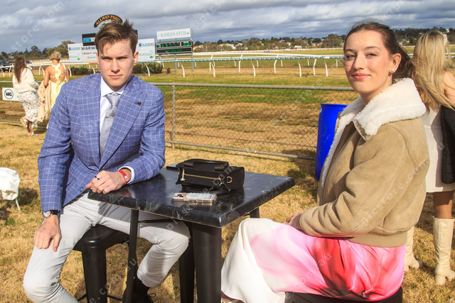 Lachlan Naughten and Teresa Winstanley enjoyed a front-row view of the action at the Warwick Automotive Picnic Races.