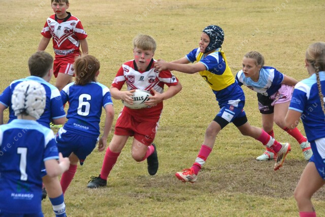 Under-10s Kingaroy Stripe tries to dodge the Nanango White defence. 485969_20