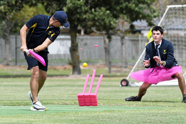 Will Louw (Technology teacher) is bowled as his castle gets tipped over. 461992_09