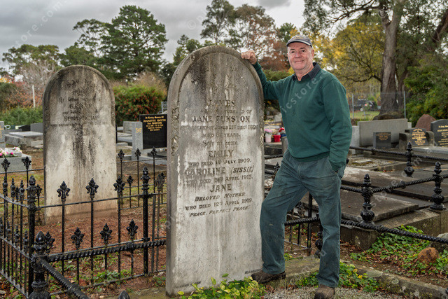 Adrian Funtson at Berwick Cemetery next to one of the older graves and a family member.
