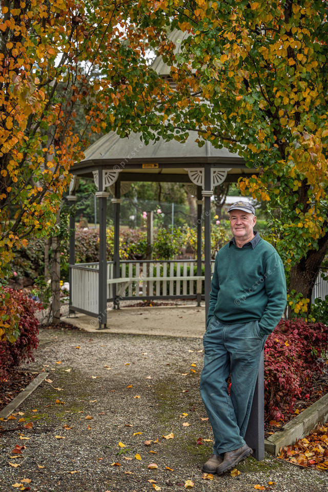 Adrian Funtson next to the Gazebo that bears his father’s name Allan Funtson, in memory and thanks for the work he did at the cemetery.