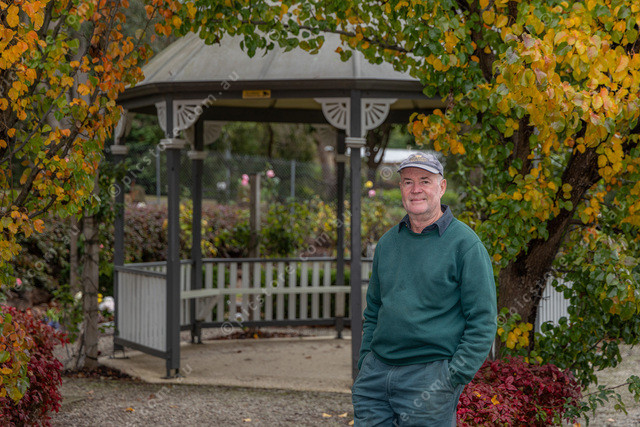 Adrian Funtson next to the Gazebo that bears his father’s name Allan Funtson, in memory and thanks for the work he did at the cemetery.