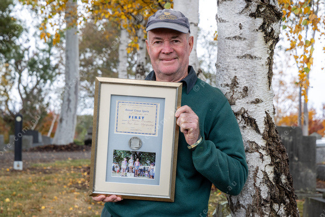 Adrian Funtson with a photo of him as a kid with an award for the 100m dash. Note Pakenham Gazette is on the award.