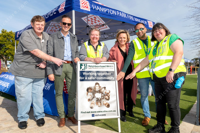 From left, Keith Grant (SES Narre Warren), Casey Mayor Cr Stefan Koomen, Casey Cr Carolyn Eaves, Pauline Richards MP, Damien Rosario (Neighbourhood Watch Casey), Jo Ann Fitzgerald (Neighbourhood Watch Casey). 482738_04