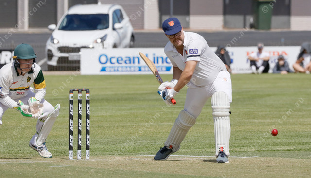 Wayback vice-captain Tom Bascomb is about to play the ball off of his toes, as Charlton wicketkeeper Camden Madden waits at the ready. (467683_12)