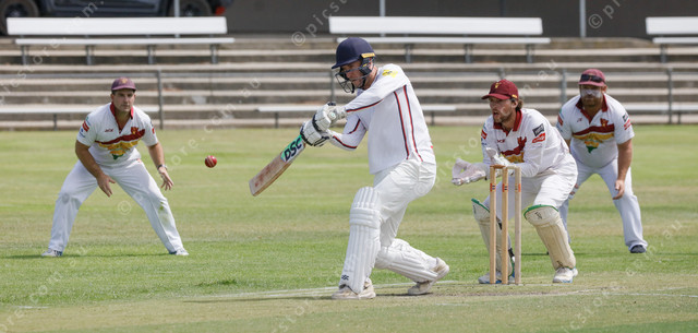 David Mansfield gets his bat underneath the ball for Wayback, watched on by Southern Eyre South wicketkeeper Adam Green and slip Liam O’Dea. (466240_02)