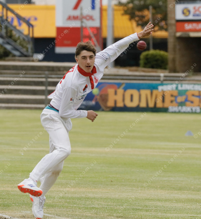 Tasman’s Marlie Fauser watches his ball fire down the pitch. (Jack Davies: 460155_08)