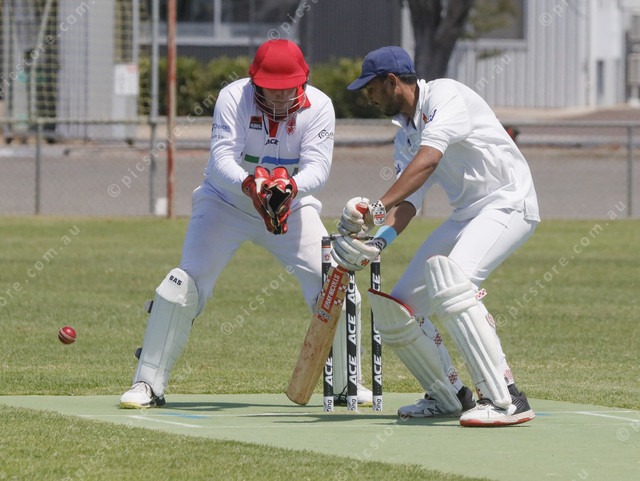 Wayback’s Sneh Trivedi guides the ball towards the slips cordon. Tasman wicketkeeper Jarrad Sykes watches on. (535065_06)