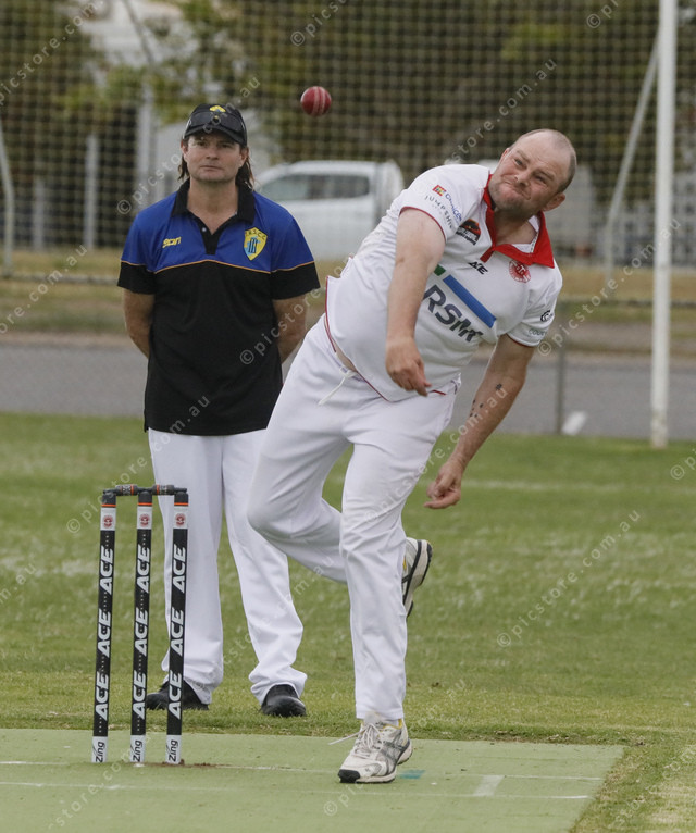 Tasman’s Andrew Frick lets the ball fly during his bowling spell. (513173_04)
