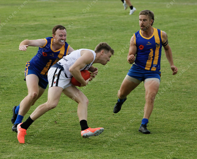 Marble Range player Guy Hutchinson is under pressure from Lincoln South’s Dylan Blewit and Aiden Baker. (474705_03)