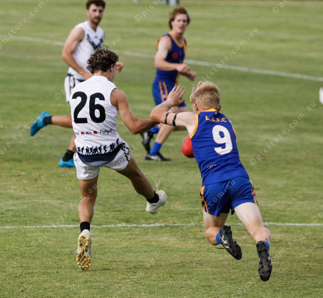 Cooper Puckridge manufactures a kick for Marble Range as Lincoln South’s Cohen Dinnison closes in to smother. (474705_07)