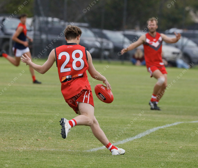 Tasman Imperial’s Cooper James kicks toward his teammate in the A grade match.474705_11