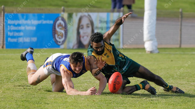 Lincoln South player/coach Johann Wagner and Mallee Park’s Alex Richards battle for the ball. (491406_03)