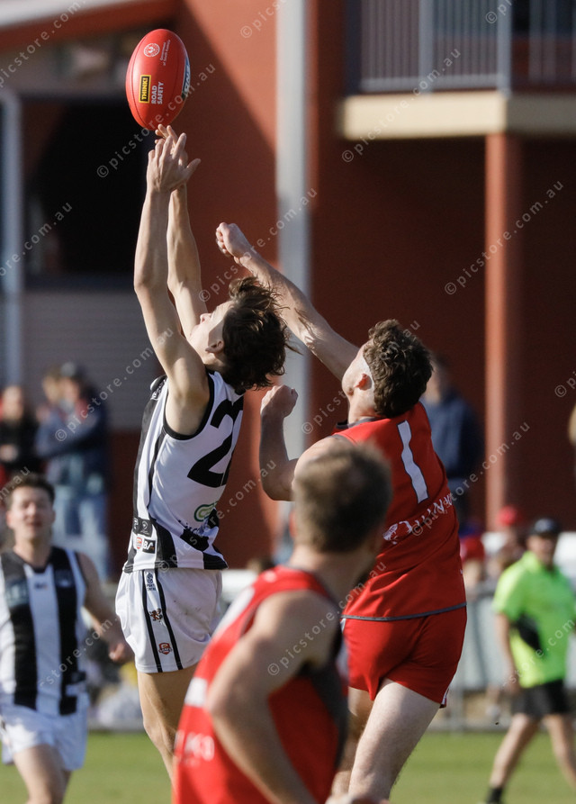 Marble Range player Cooper Puckridge about to take the mark as Tasman Imperial captain Cooper Perham attempts to spoil. (491406_04)