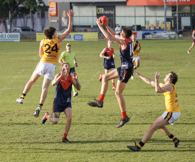 Lucas Blight in flight for Wayback, marks the ball which got past leaping Boston player Cameron Sellen. (491406_08)