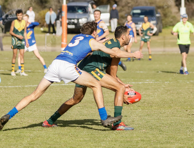 Lincoln South’s Colby Syvertsen closes in on Mallee Park player/coach Ky Miller who looks for a handball. (491406_10)