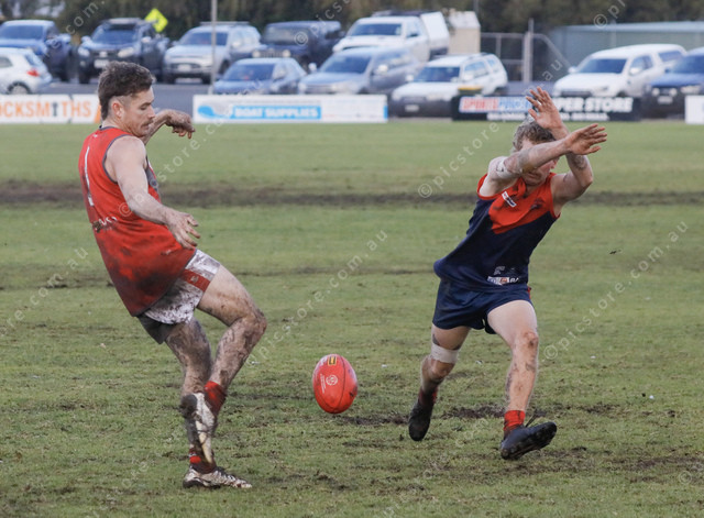 Cooper Perham kicks for Tasman Imperial while Wayback’s Ned West attempts to smother. (492890_01)