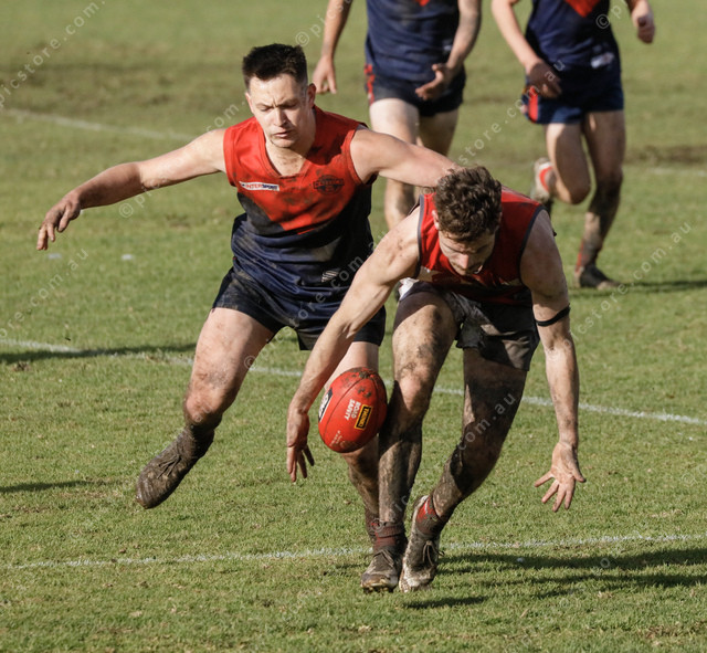 Wayback’s Beau Sampson closes in on Tasman Imperial’s Cooper Perham. (492890_04)