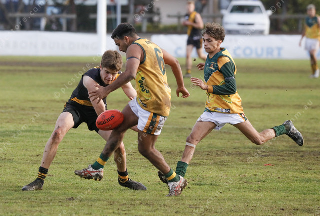 Boston’s Tyson Simpson and Mallee Park’s Sanjayson Hanuman attack the ball. Mallee Park player Frank Kartinyeri provides an option. (492890_05)