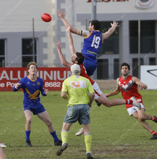 Lincoln South ruckman Jackson Masin wins the hit out against Tasman Imperial’s Tyson Collins and taps the ball in Connor Madden’s direction. (497262_01)