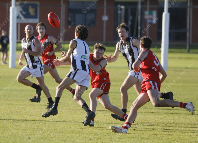 Ashur Miller-Pickett gets a handball away for Marble Range as Tasman Imperial player Jackson Tansell tackles. (498731_12)