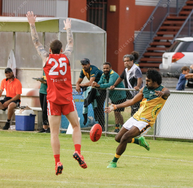 Michael Burgoyne kicks for Mallee Park, while Tasman Imperial’s Kodee Spry jumps in an attempt to smother. (476286_05)
