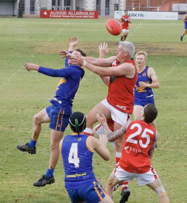 The ball spills from the contest between Lincoln South’s Connor Madden and Tasman Imperial player/coach Reece Francis. Watching on is Lincoln South’s Tahj Bryant and Cohen Dinnison and Tasman Imperial’s Kodee Spry. (479153_06)