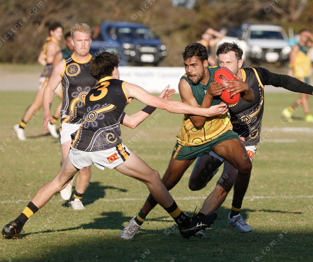Mallee Park’s Daniel Kartinyeri looks to evade the tackle from Boston’s Tiarnan Cochrane and Brad Keast. (Jack Davies: 482092_07)