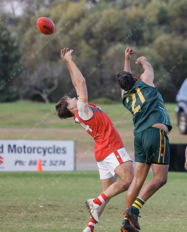The ball spills from the contest between Mallee Park’s Dean Miller and Tasman Imperial’s Dean Lockwood. (484771_03)